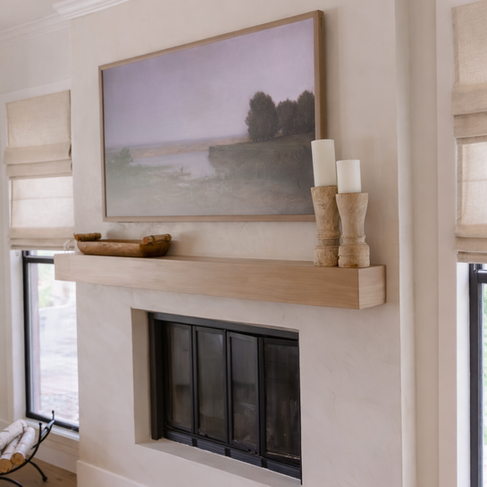 The fireplace serves as a quiet focal point, framed by Venetian plaster and topped with a substantial oak mantel that grounds the room. Artwork and collected objects were chosen to feel personal and timeless, reinforcing the sense that the home has evolved naturally rather than being overly styled.