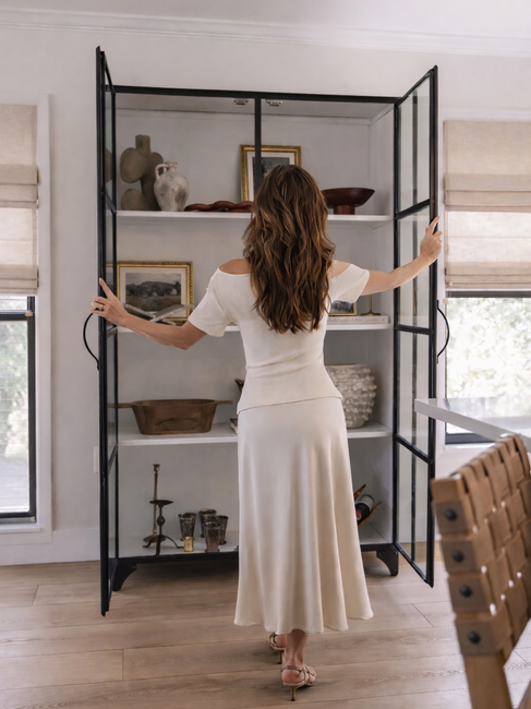 In the dining area, sculptural lighting and warm wood tones create an intimate gathering space, while curated storage pieces introduce a subtle European influence. Each element was selected to support the overall narrative of the home—one rooted in restraint, craftsmanship, and enduring materials.