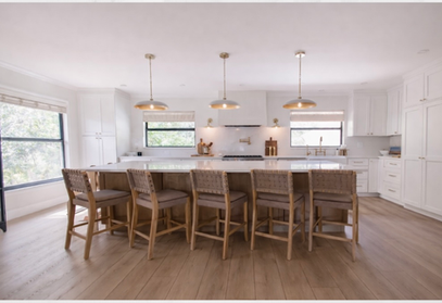 The entire floor plan was reimagined to allow for family gatherings and open living for a young family of 4. A custom plaster range hood, brass pot filler, and subtle veining in the stone backsplash introduce understated craftsmanship, while warm oak detailing at the island adds depth and contrast to the surrounding cabinetry. Soft Roman shades and aged brass lighting create a gentle rhythm across the space, allowing light and texture to take center stage.