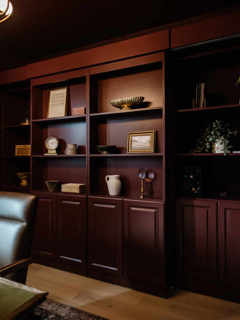 Painted in a deep, wine-inspired hue, the study is enveloped in drama. A Custom built-in Murphy bed displays collected objects and books, while a leather chair and green writing desk bring gravitas.