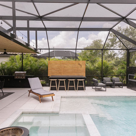A modern oasis that a bit Tulum Mexico inspired by their travels felt appropriate. This couple has a daughter in college and the goal was to also make this outdoor area “cool enough” for her to want to stay and bring her friends. Steel grey leathered granite countertops provide the right amount of practical texture to the space. The vertical paneling on the cabinets take the edge off a modern feel by adding some character and detail. The numbers 1872 were added to their bar area honoring Johns father; remembering the year his Dads Soccer team was established. A projector was mounted for outdoor movie nights to be screened literally from their pool. The outdoor space is meant to be an full experience and respite for this family to share with loved ones.
