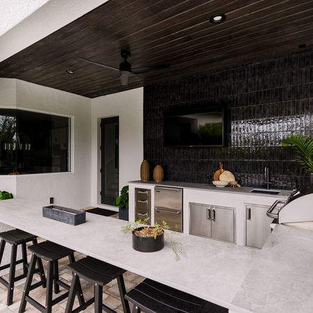 Stone pavers were installed along with an outdoor custom kitchen, custom tile work, and ceiling work that paired so beautifully with our clients fresh done landscaping.